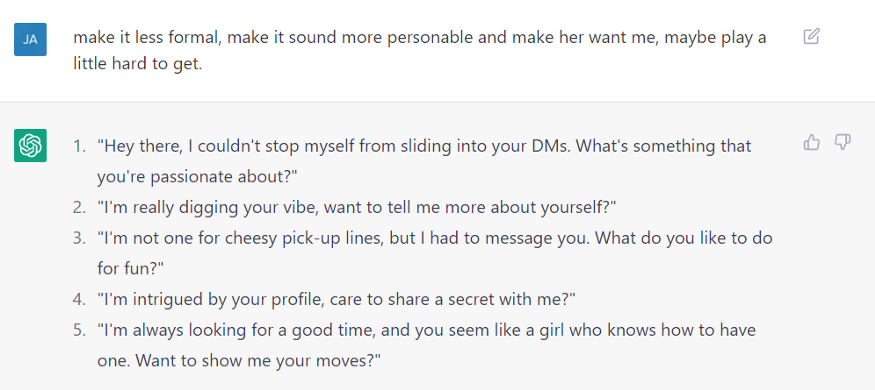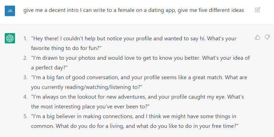 So I had a little play around with number 2, dating app pick-up lines — the least useful out of every use case for ChatGPT.