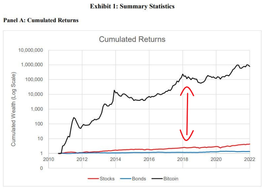 Since 2010, Bitcoin returns have outperformed stocks and bonds by a country mile.