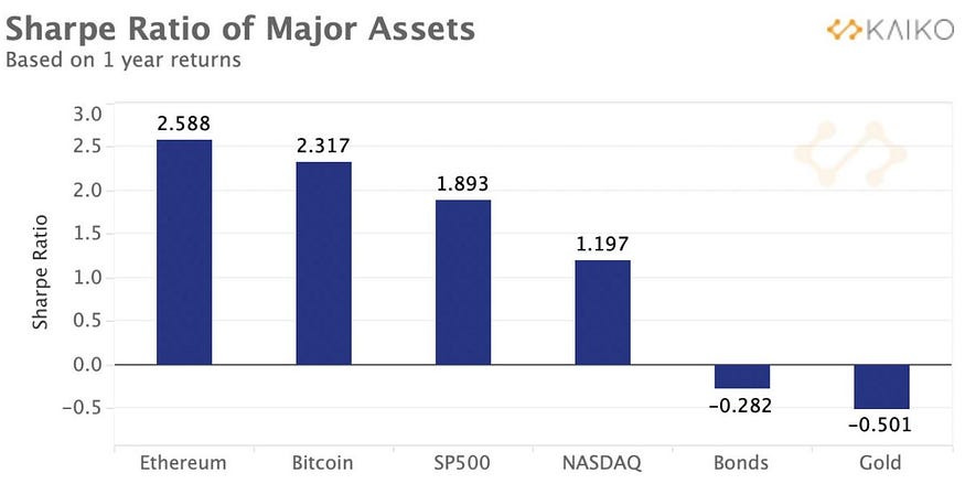 Bitcoin and Ethereum have significantly outperformed traditional and so-called “safe” assets like Gold & Bonds regarding risk-adjusted returns.