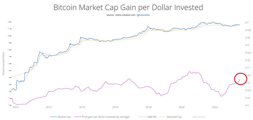 It creates a fascinating phenomenon known as “The Bitcoin Multiplier Effect,” where every $1 of demand currently results in a $3.7 increase in the market cap.