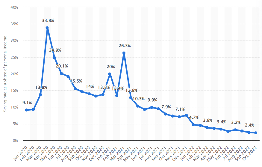 As of October 2022, personal savings in the United States amounted to only 2.4 per cent of Americans’ disposable income (currently, it’s 4.1%).