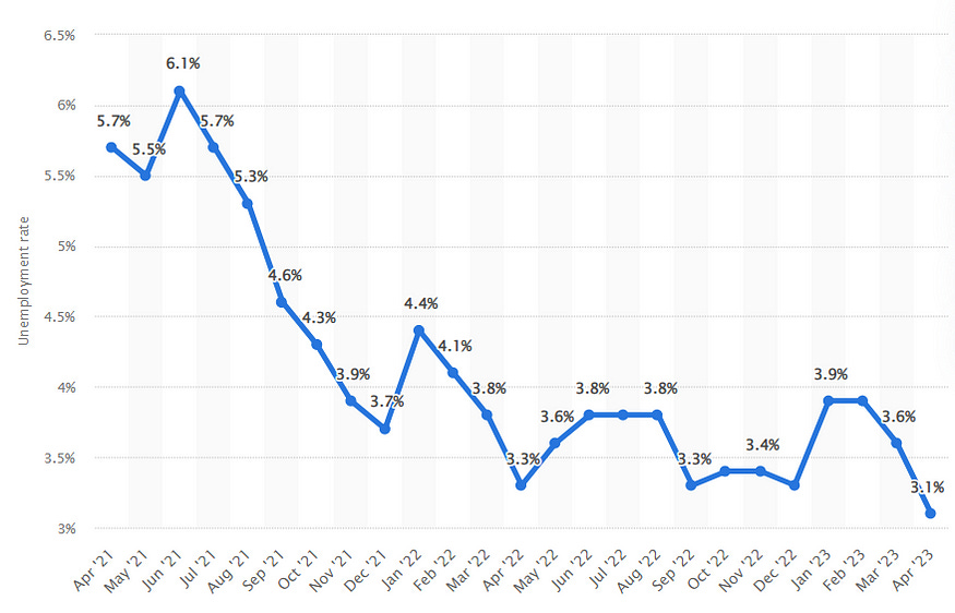 Unemployment is going down, and it’s not a good sign. The Fed’s target unemployment rate is 5%, currently at 3.1%.