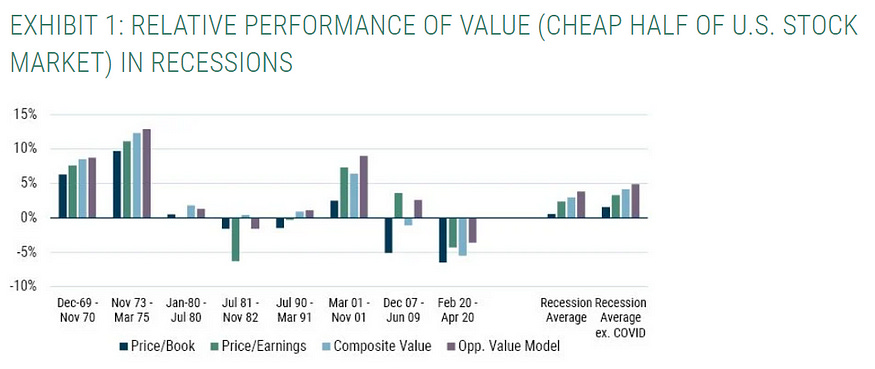Performance of value stocks during each of the major recessions. The only exception was during 2020 when there were imposed global lockdowns.
