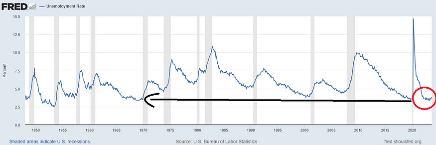 The Fed has taken inflation from 8.2% to 3.7% in the last year, and unemployment is as low as ever since the 1970s at 3.8%, below their target of 5%.