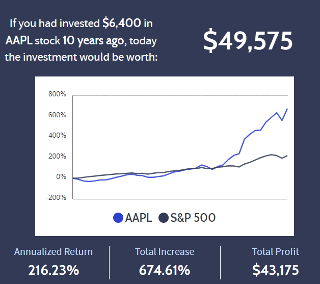 Using $6,400, which is, on average, the value of two month’s salary in the USA, if you invested a decade ago into Apple stock when people were saying the stock was high, you’d have had returned profits of $43,175.