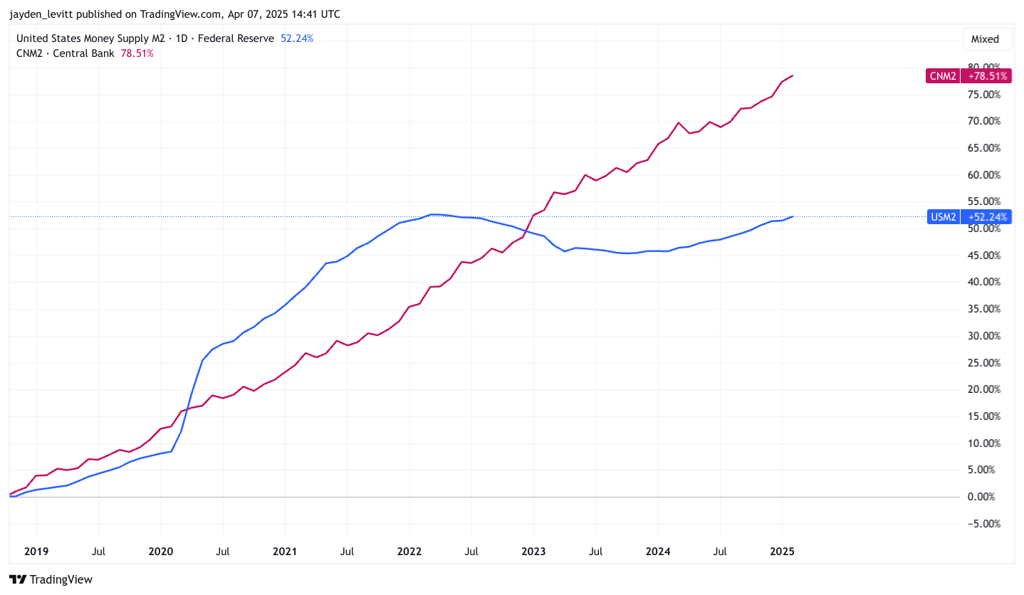 In red below, the Public Bank of China is printing money like it's going out of fashion. After a squeeze in conditions in December 2024, the Fed has now increased the M2 money supply, which is nearing all-time highs again in blue.