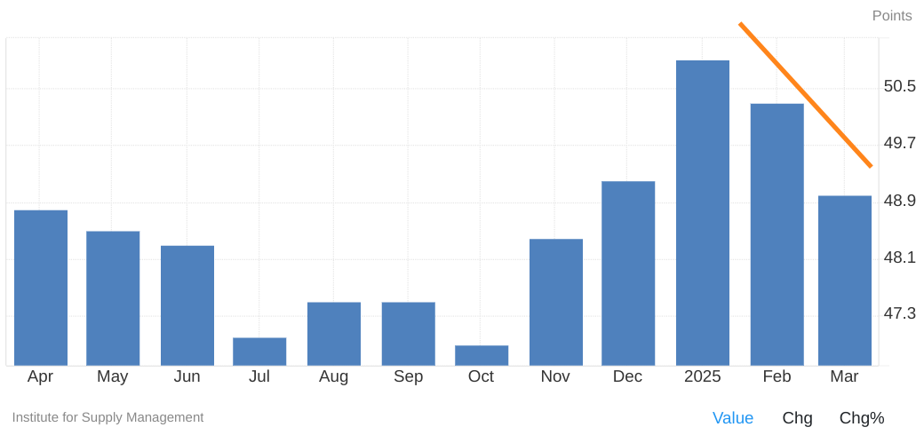 March came in at 49, down from 50.3 in February and below the forecast of 49.5.