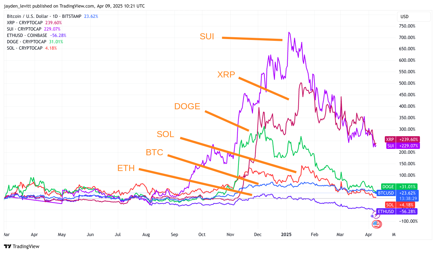 Asset prices are getting crushed by the tariff headlines, and crypto — which has been the fastest horse in the race — is now the worst performer.
