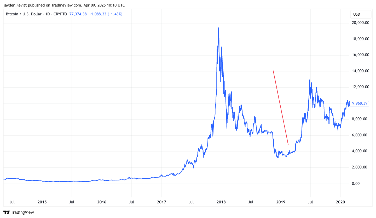 Below is a chart of Bitcoin. I bought the literal top in December 2017 — peak euphoria — and watched my investment crash all the way down.
