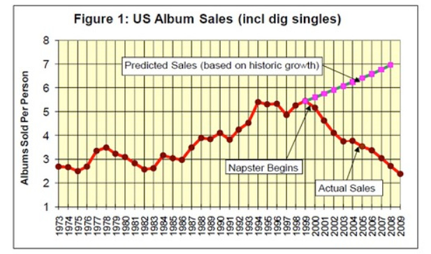 Below you can see a considerable decline in album sales. Regulators later shut Napster down, but the underlying technology was here to stay.