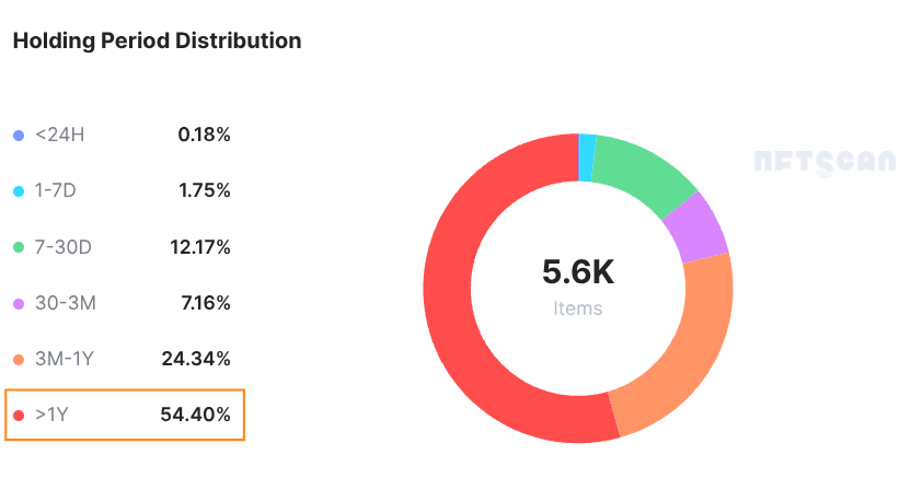 54.40% of the supply hasn’t moved in over a year, and over a 24-hour period, only 0.18% (9 tokens) out of 5,555 are traded, making this a sticky collection.
