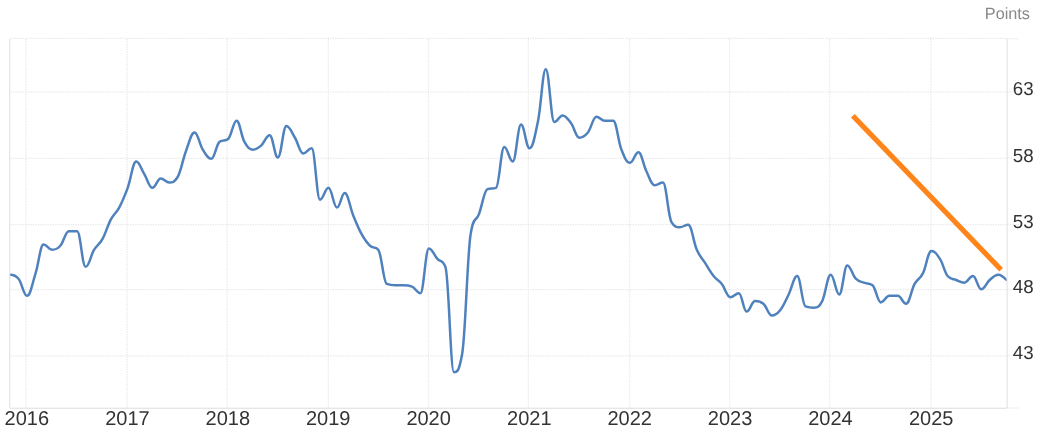 The ISM index tends to oscillate between bear and bull territory, a bit like a heart rate monitor, but rarely trades sideways. Except for a few anomalies, like Trump playing fuck around and find out with his tariff button.