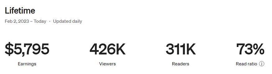 A blog that had taken me four solid days to research and write generated 426k views and 311k reads and earned me, to date, $5,795.00, and it’s still earning.