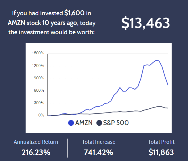 “If you live in America, the average take-home salary is $3200 after tax. You’d have earned significant returns if you invested half, so $1600, into a growth stock for just one month and left it there for ten years. If you had invested in Amazon, for example, you would have enjoyed returns of 740% and made just under $12000 in profit.