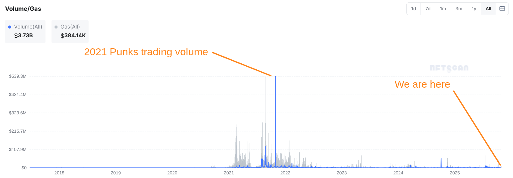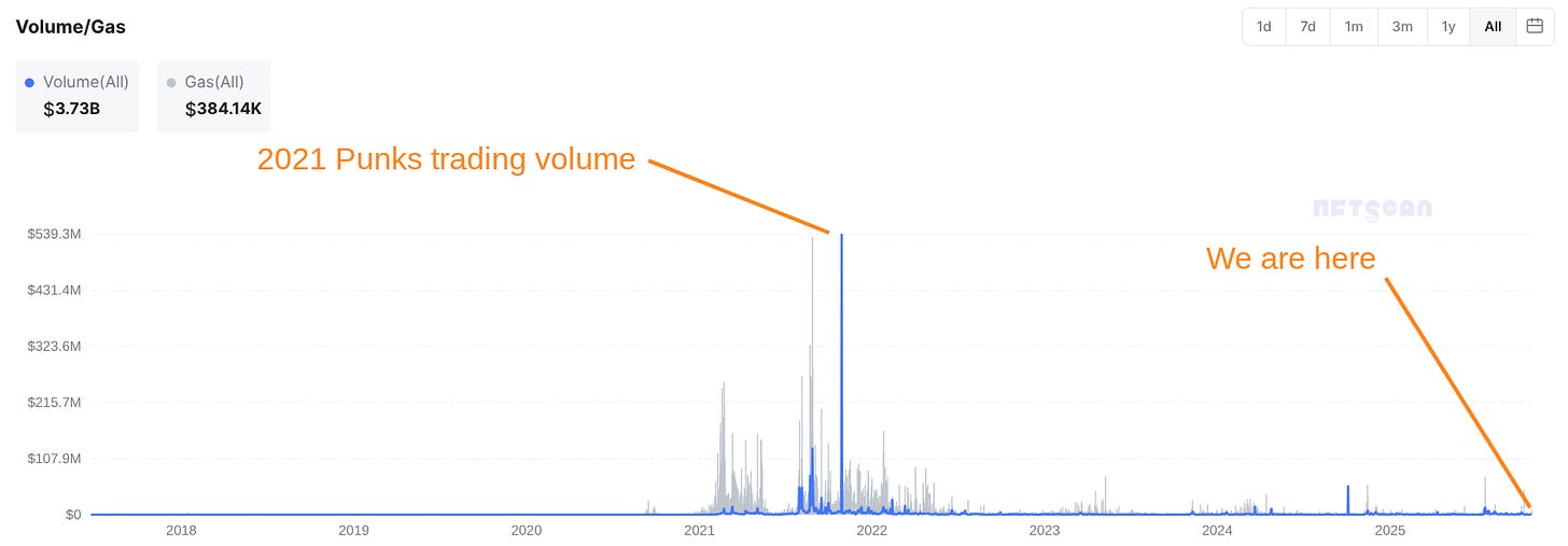 The token itself has been flat for a while and has bled out, but you can see what happens every time anticipation builds around a Punk being bought (or sold) through the protocol: the price starts to lift again, so the interest is sustaining.