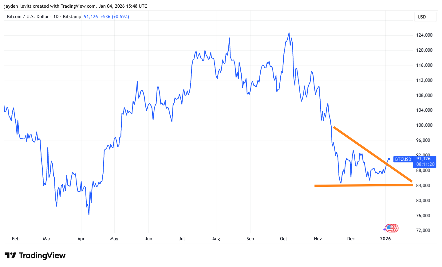 What we saw was either tax-related selling or people selling out, still playing the old four-year cycle framework. The reasons are irrelevant. Over the last six weeks, we have had a strong consolidation period and a slight recovery, creating a short-term wedge pattern.