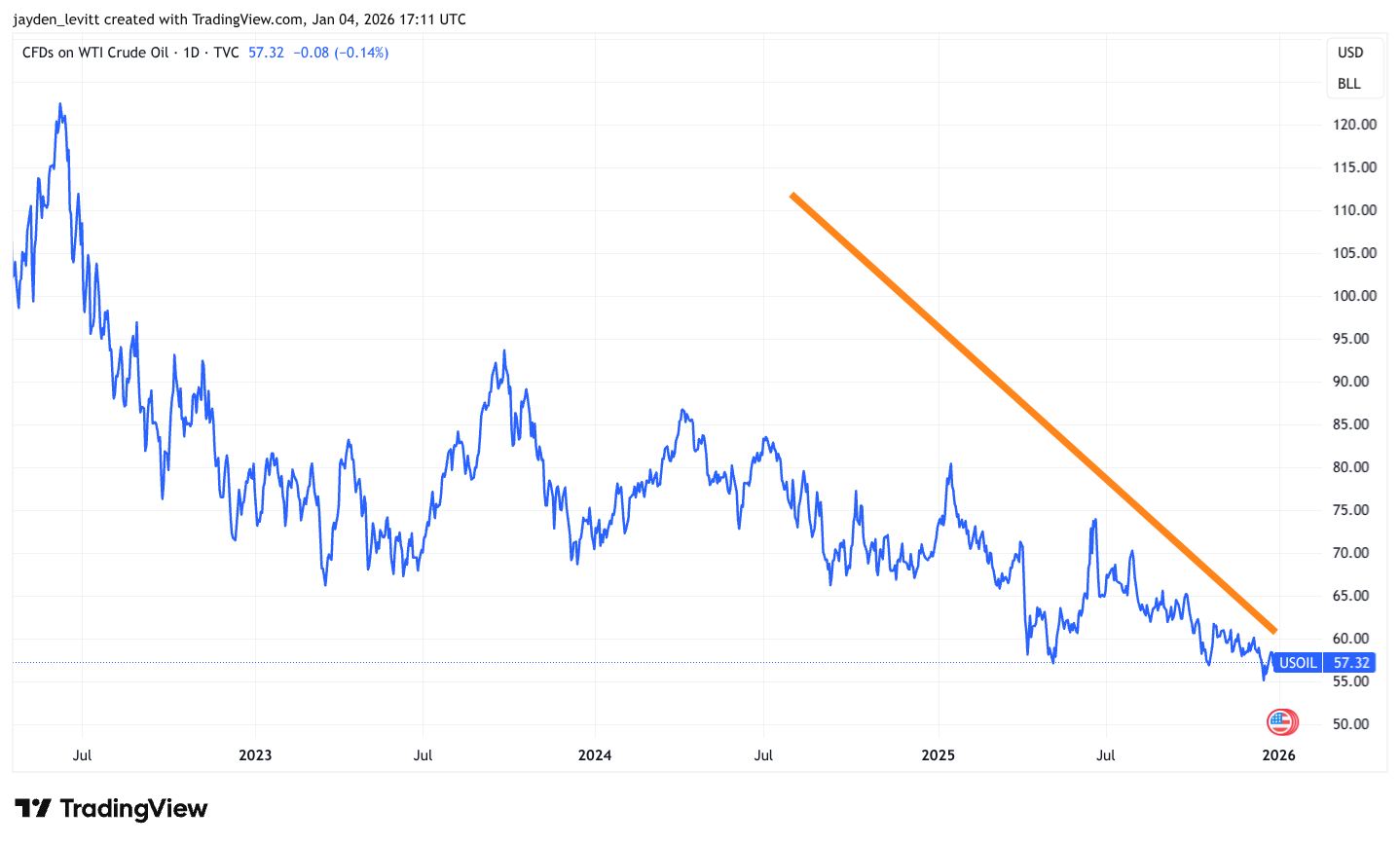 After the recent turmoil in Venezuela involving the literal kidnapping of the president and the obvious elephant in the room of the country sitting on a huge amount of oil, combined with Trump’s recent comments about the US likely selling its oil, prices have dropped even further, which is bullish for Bitcoin.