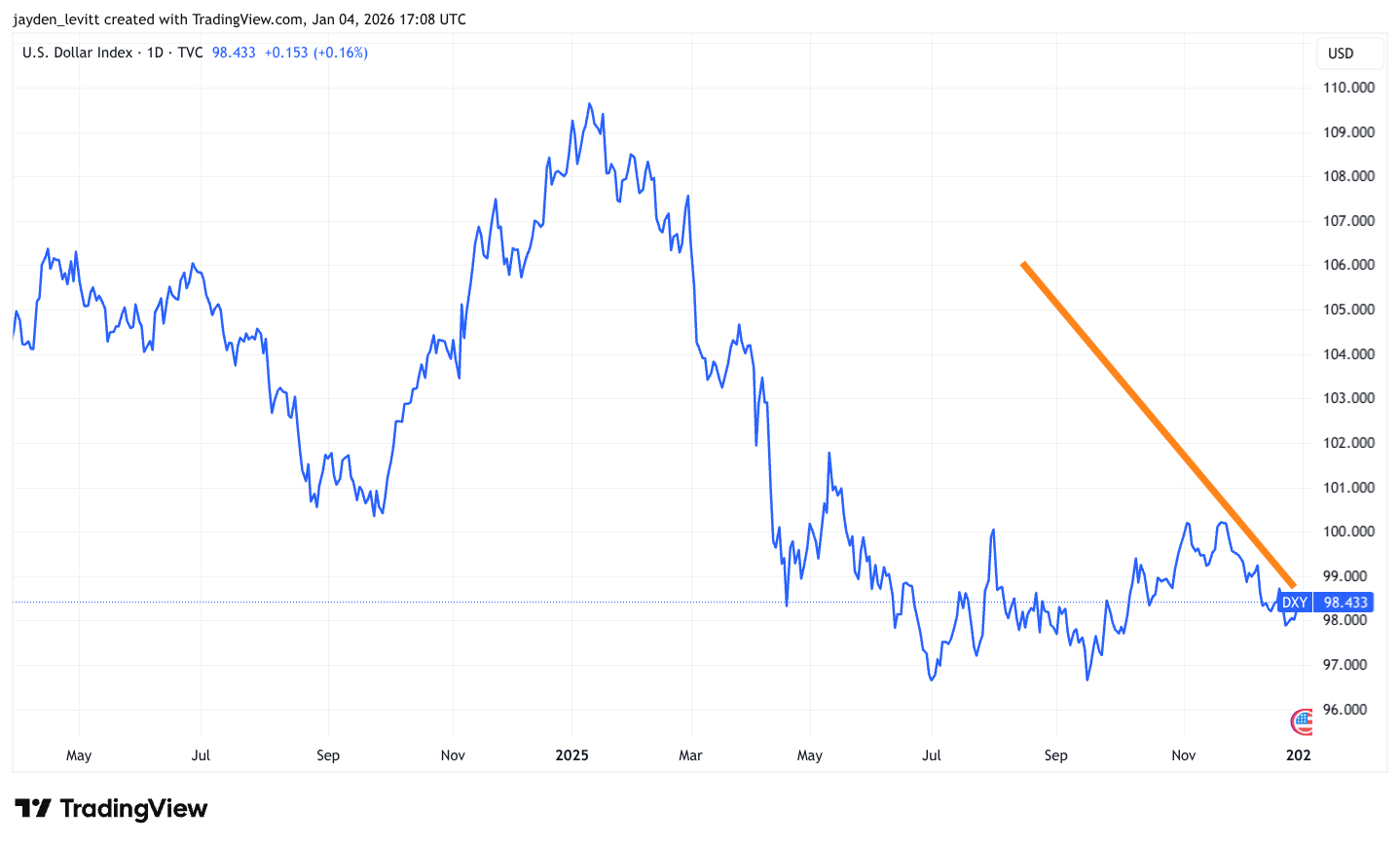 Right now, we’ve got record stock-market highs, the lowest inflation since the pandemic, oil at five-year lows, and interest rates coming down. The dollar, the liquidity provision for the entire system, is also falling, which signals far more positive tailwinds ahead.