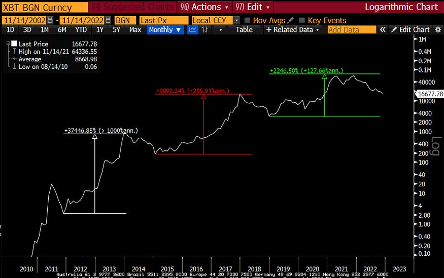 Below, the Bitcoin chart measures each new low, beating the previous high dating back to 2012.