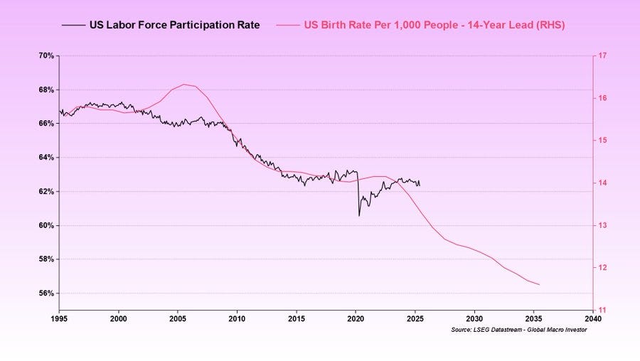 “The labor force participation rate isn’t going to rise anytime soon – it’s set to keep declining over time. This is a structural problem… We’ve got aging demographics, falling birth rates, and now the rise of automation. Humans are already being replaced by AI and robots at a staggering pace, and that shift is only just beginning. This is deflationary. It also reinforces the need for ongoing stimulus to keep the system afloat. Fewer workers. More tech. Same debts…”