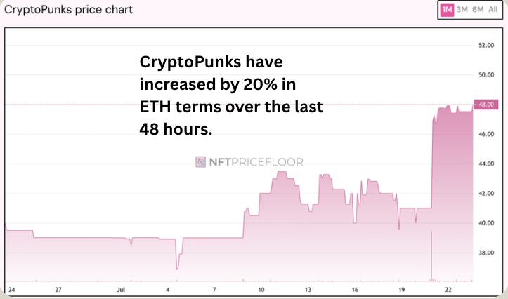 CryptoPunks jumped 20% in just 48 hours, which is wild, especially given how high the entry price already is.