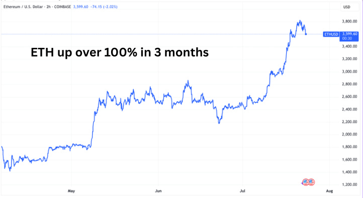 So it’s not just the NFTs’ buy-and-sell demand driving prices up—it’s also the fact that ETH, the underlying asset, can increase and has increased nearly 100% in the last 3 months.