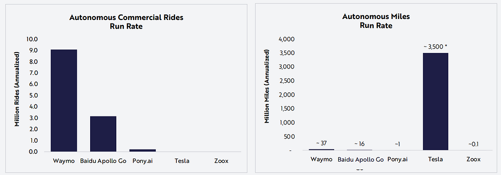 Waymo dominates autonomous rides in the U.S. and Baidu in China, as shown on the left below.