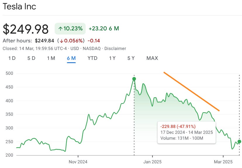 Between Trump’s flip-flopping on tariff policies—seemingly to stir uncertainty and pressure the Fed into reversing interest rates—and activists venting their first-world frustrations on perfectly good cars, the stock price is falling faster than a broken elevator.