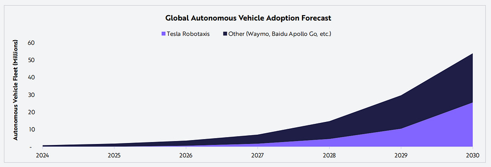 If Tesla went all-in — turning every future car into a robotaxi instead of the expected 30–40% — they could hit Ark’s entire industry forecast solo.