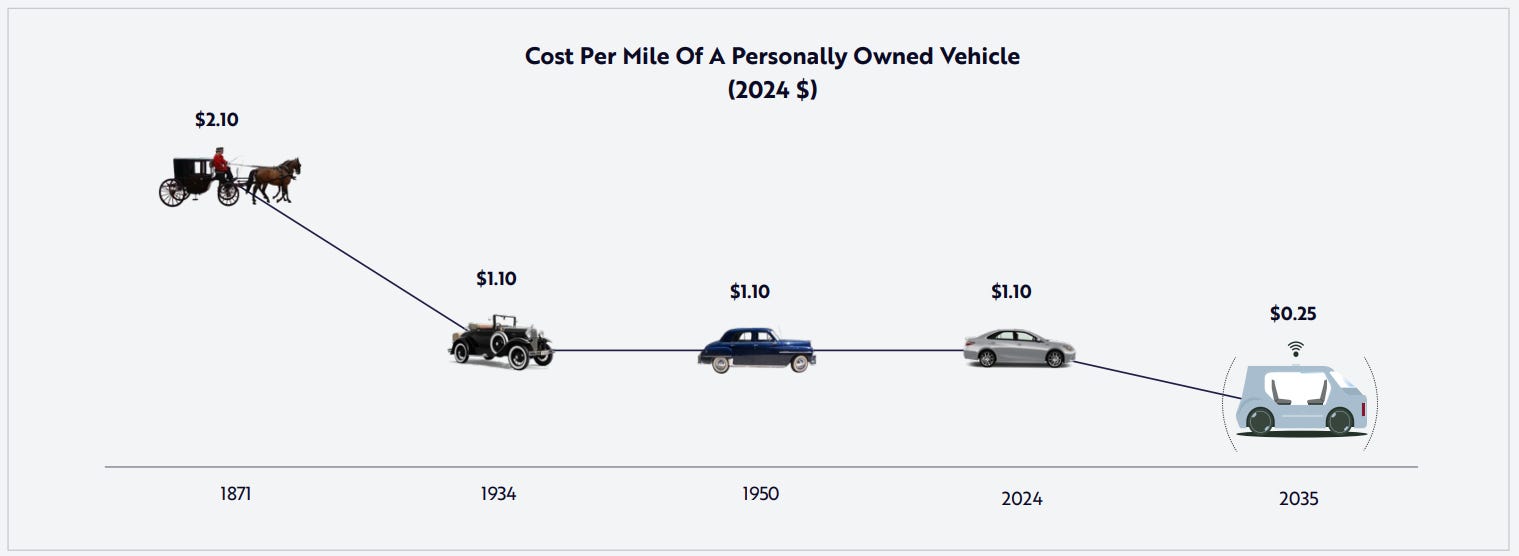 ARK estimates that once autonomous taxis hit scale, they could cost as little as $0.25 per mile, almost 80% cheaper, making mass adoption inevitable.