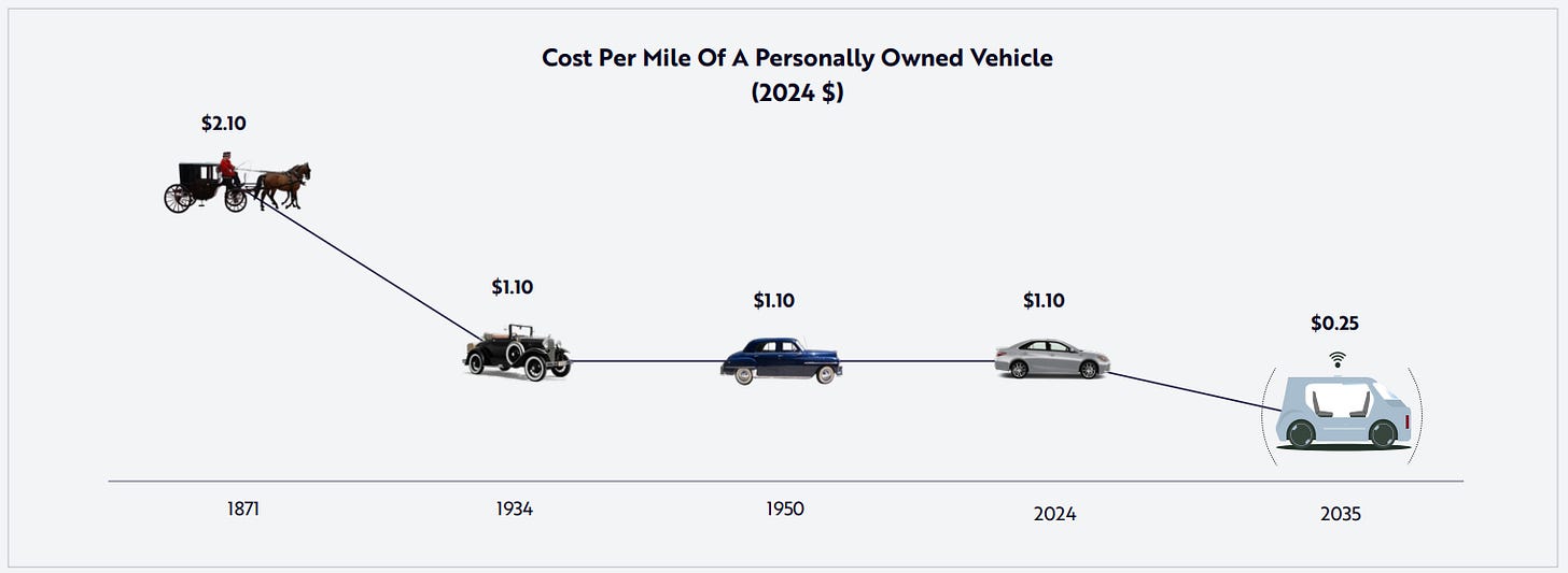 “Autonomous electric travel should reduce costs, including fuel, insurance, and deadhead miles, thanks to higher utilization, increased safety and efficiency, and electric drivetrains. Deadhead miles are the number of miles driven without passengers, which account for 45% of ride-hail miles today. Autonomous vehicles could reduce deadhead miles by removing the human-in-the-loop and harnessing AI tools to predict demand and traffic patterns.”