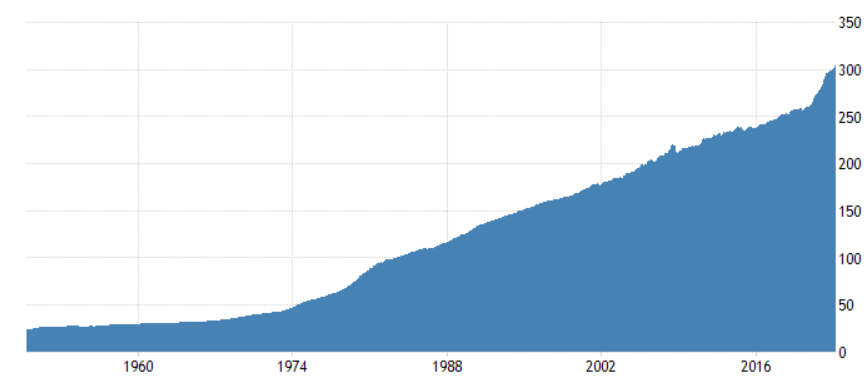 The government have tracked CPI in the U.S. since 1950. Over that period, the average CPI value has been 121.23 points.