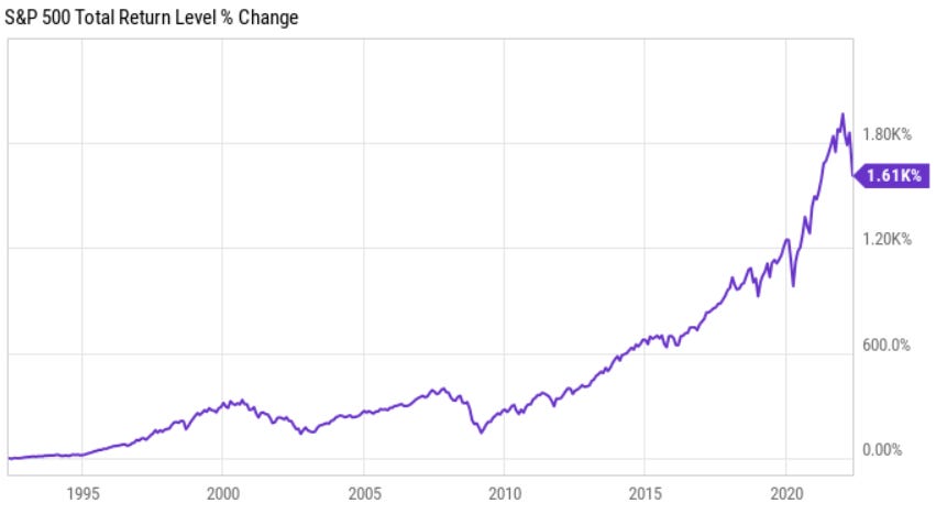 If you had invested $10,000 in the S&P 500 index in 1992, 30 years ago and reinvested dividends, you’d now have more than $170,000.