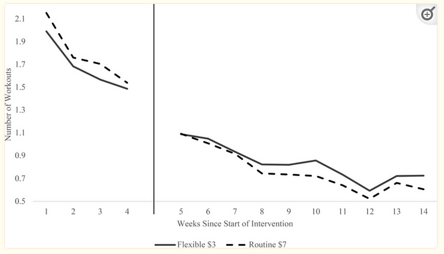 The flexible gym routine group receiving $3 attended the gym 8% more often over a more extended period than the fixed group participants receiving $7, who had a steep drop-off.