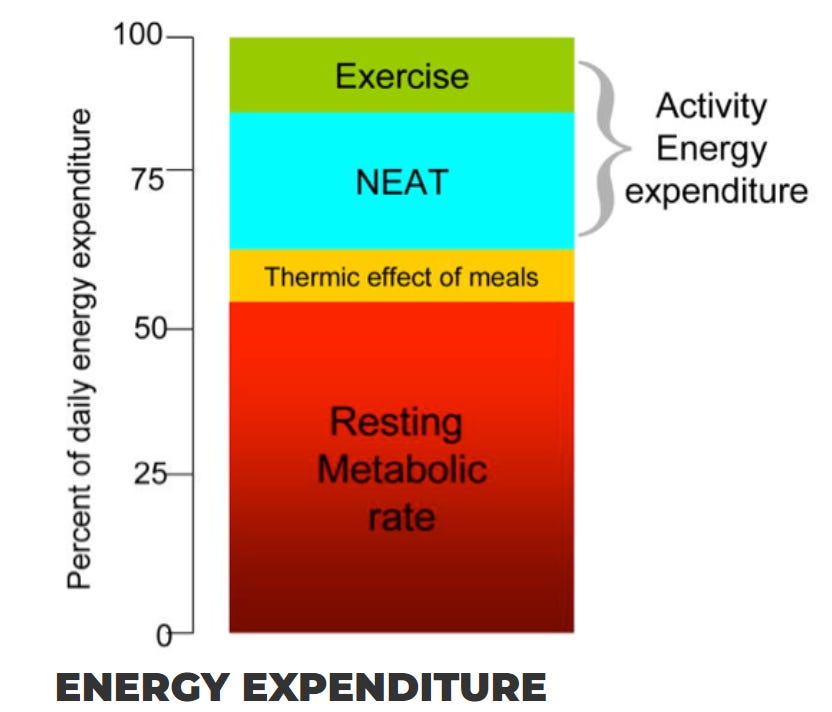 High levels of NEAT are directly associated with lower levels of obesity. As you can see, actual “exercise” only makes up around 15% of all the calories we burn daily.