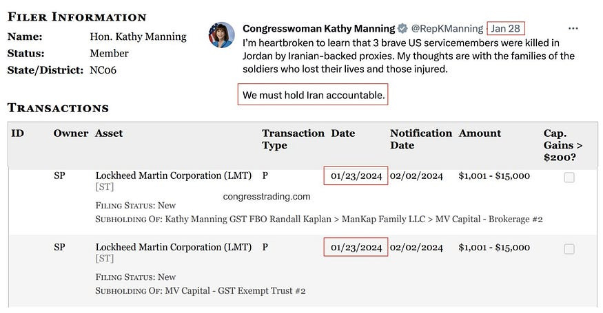 Take Congresswoman Kathy Manning, who Tweeted: "We must hold Iran accountable" just five days after she purchased a chunk of Lockheed Martin's stock ($LMT).