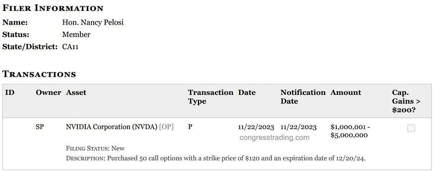 On November 22, 2023, Pelosi and her husband invested in Nvidia ($NVDA) calls.