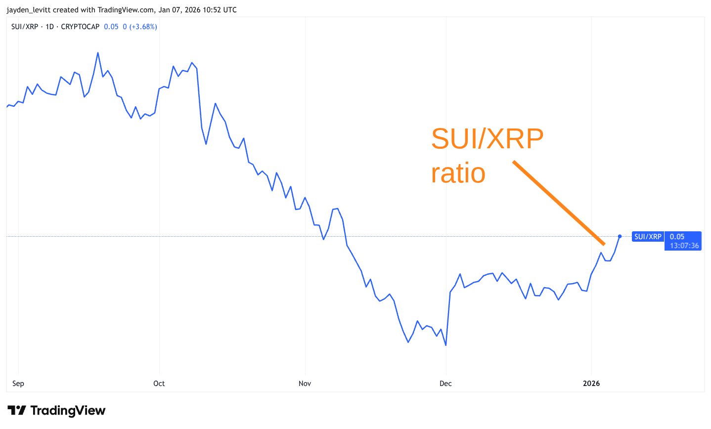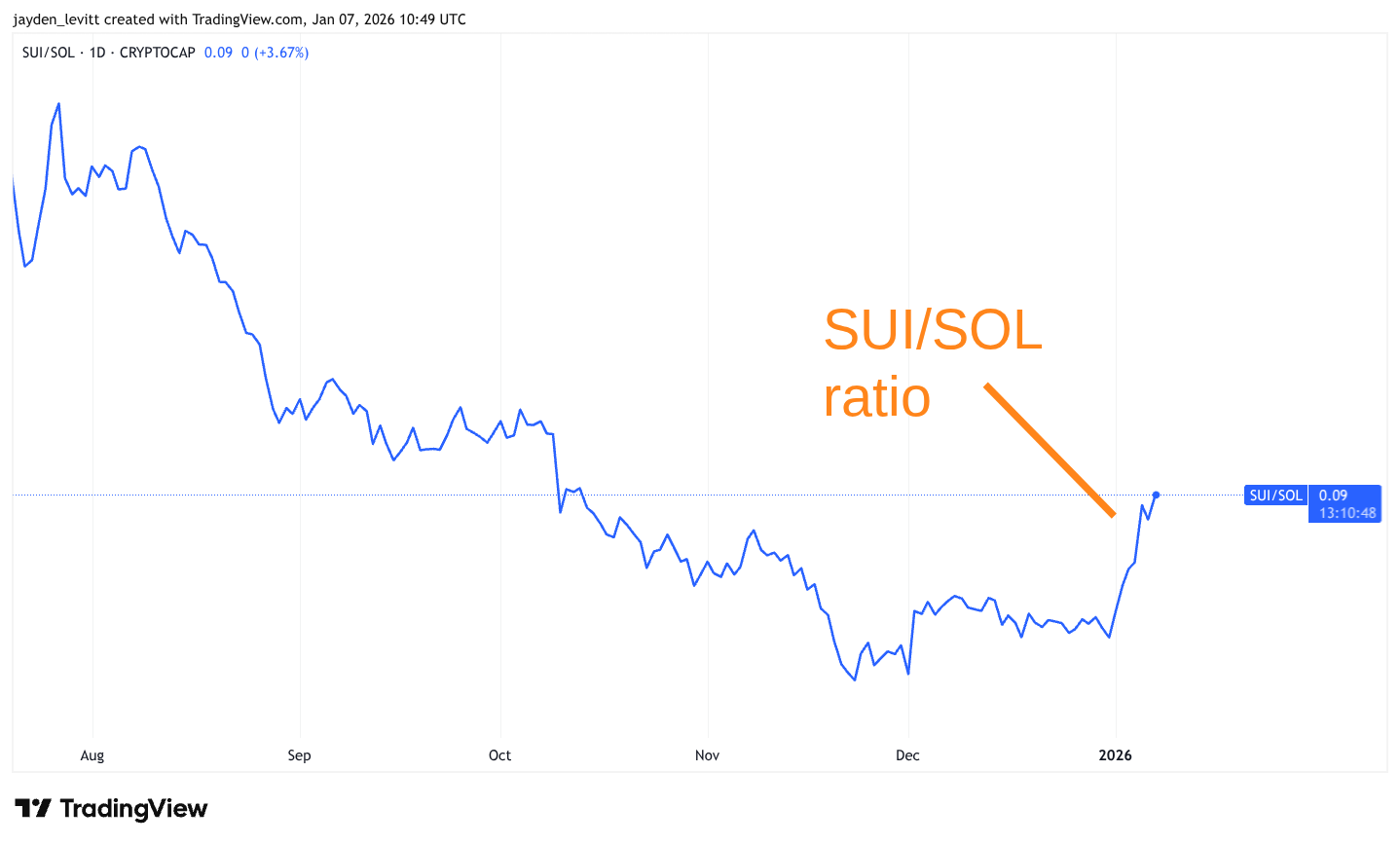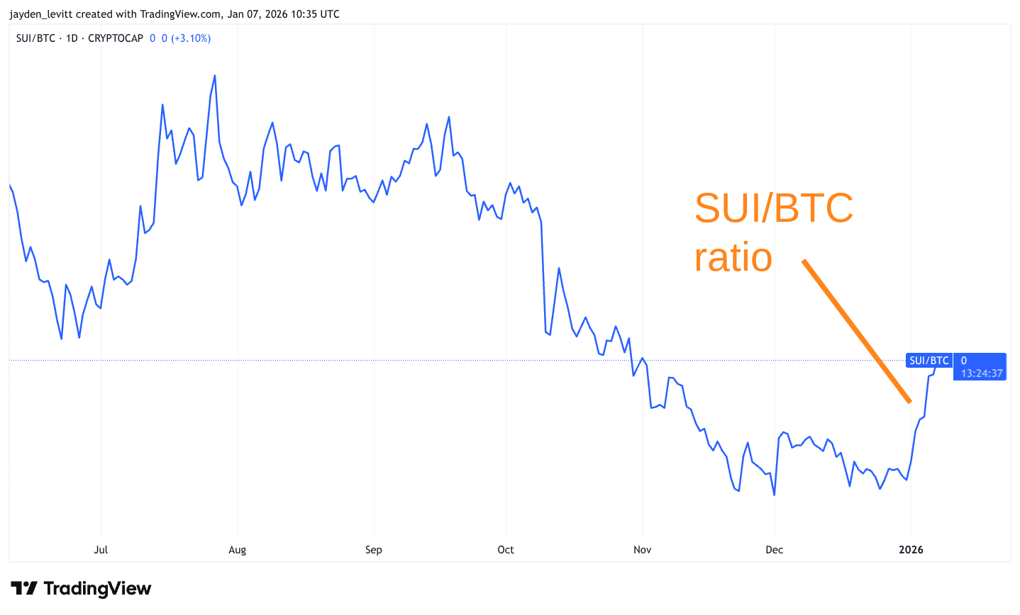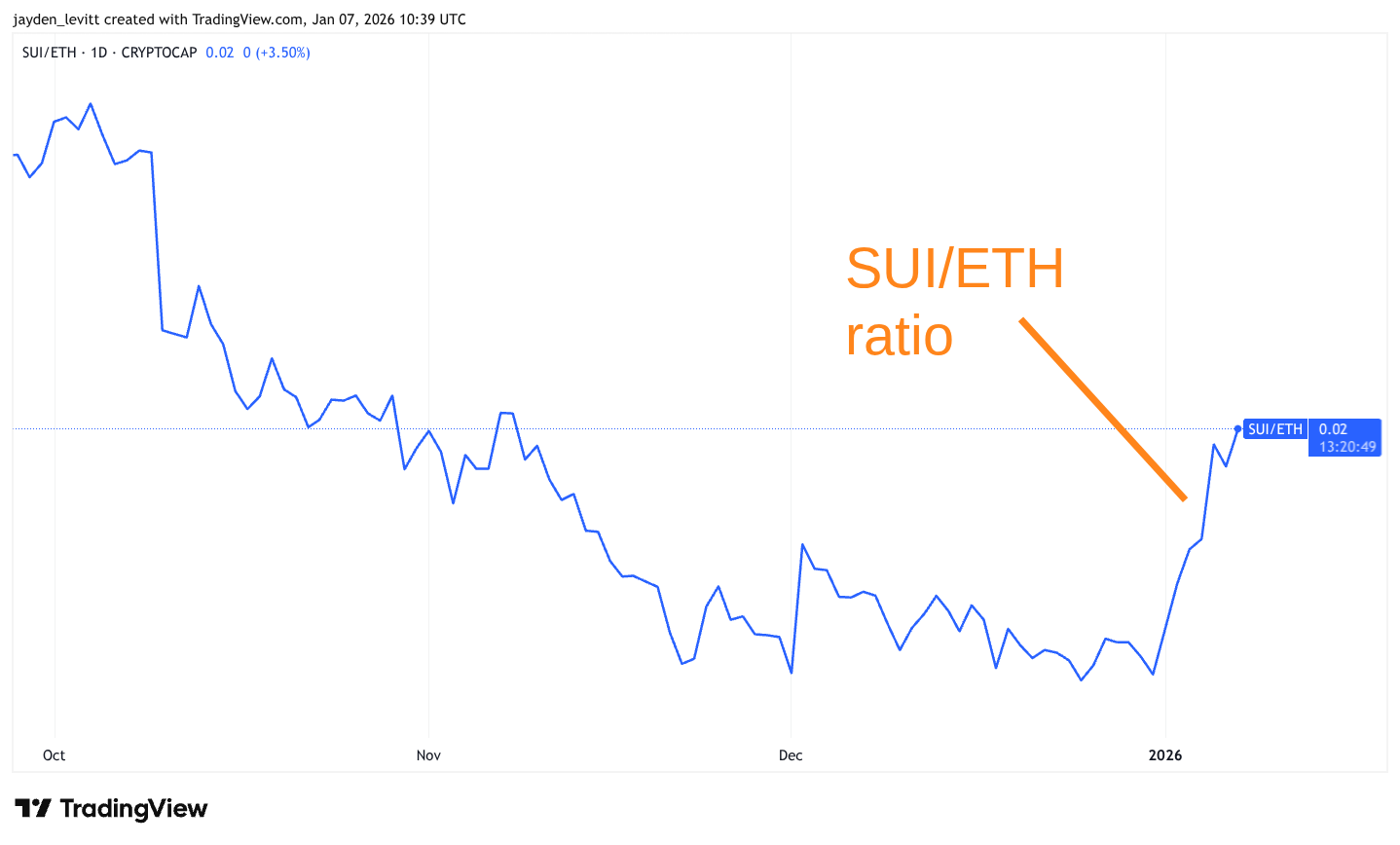 But as we headed into Q1 this year, Bitcoin’s price recovery to $90k lifted everything with it. Ethereum increased, and SUI increased as well. When you pair SUI with Ethereum, you can see the outperformance clearly. That’s simply because SUI is smaller. Ethereum sits at around $390 billion. SUI is around $7.5 billion (as of publishing).