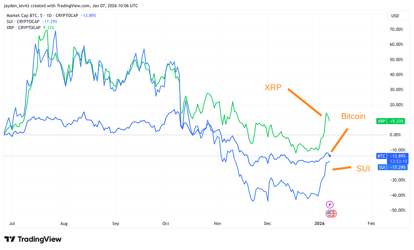 But by the same token, when Bitcoin draws down, you get huge downswings, and recently, after Bitcoin’s recovery, we've seen the two top movers back in action again: SUI and XRP.