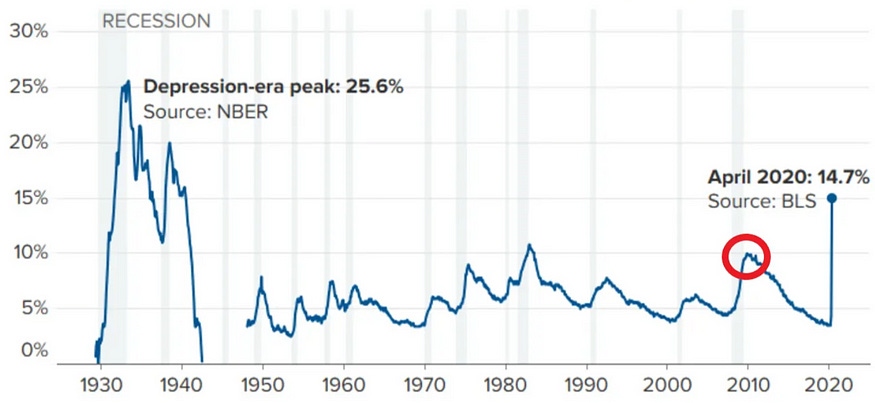 During the 2008 Recession, the country’s GDP decreased by 4.3%, and the highest unemployment rate was less than 10%, still well below the 25% of the Great Depression.