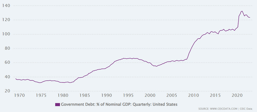In December 2022, the United States Government debt was equal to 123.4% of the country’s Nominal GDP. This percentage decreased slightly from the previous quarter, which had a ratio of 123.6%.