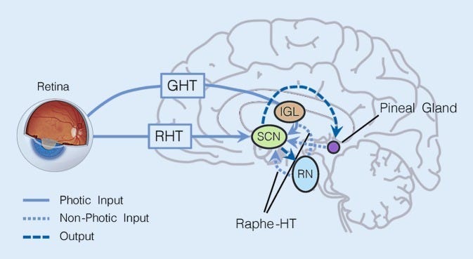 The research shows that light in our eyes sends signals to a gland in our brain called the Pineal gland, which makes a hormone called melatonin.