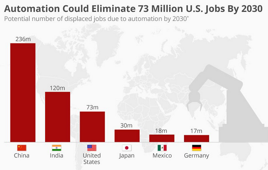It’s projected that automation will displace 20 million manufacturing jobs by 2030. 25% of American jobs are highly vulnerable to automation, potentially losing 73 million jobs within the next five years.