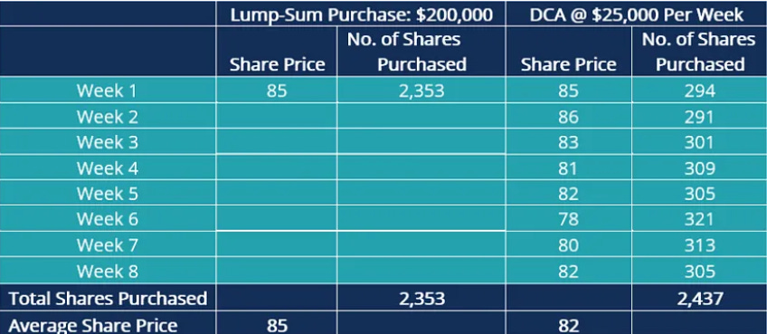 If you compare this DCA approach to investing a lump sum, you’ll see that DCA can result in buying more shares if the price is in a downward trend.