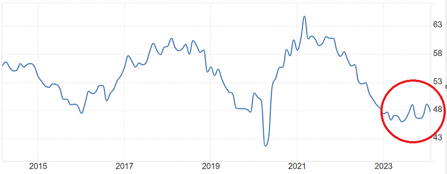 Motley Fool calculated, “Between the beginning of 1948 and January 2023, the ISM Index fell below 43.5 on 14 occasions. Except for a steep decline in the early 1950s, a drop below 43.5 has signalled a U.S. recession every single time for seven decades.”