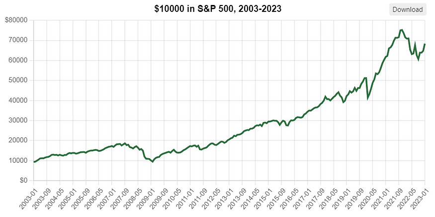 If you invested $10,000 in the S&P 500 at the beginning of 2003, you would have about $68,396.72 at the end of 2023, assuming you reinvested all dividends. This is a return on investment of 583.97%, or 10.05% per year.