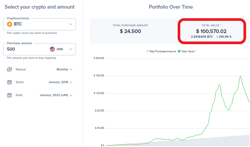 Being educated on this can be highly beneficial. Let’s consider a relatively standard personal loan duration of 50 months with a monthly repayment of $500. Instead of having that personal loan, imagine you invested the same amount monthly in Bitcoin using Dollar-Cost Averaging (DCA). Here’s what the outcome would have been.