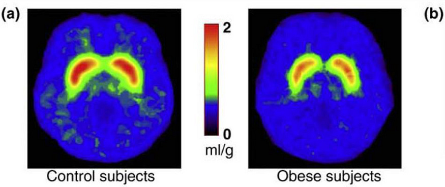 So, the outcome is — Obese people release less dopamine from eating food and enjoy it less.
