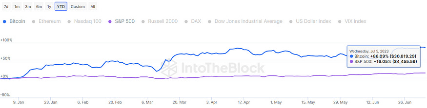 IntoTheBlock’s data shows the year-to-date growth disparity between the S&P500 (purple line) and a relatively new asset like Bitcoin (blue line).